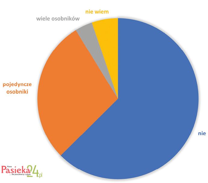 Pszczelarze byli także pytani o to, czy zauważyli objawy zakażenia wirusem zdeformowanych skrzydeł (DWV) (Wykres 3). Objawy te obejmują obecność zdeformowanych skrzydeł i skróconych odwłoków u pszczół. Większość ankietowanych (63%) w ogóle nie zaobserwowała takich symptomów w swoich rodzinach. Dwadzieścia dziewięć procent pszczelarzy wskazało, że widziało zmiany u pojedynczych osobników. Cztery procent respondentów widziało objawy u wielu pszczół w pasiece, a 5% pszczelarzy odpowiedziało „nie wiem”. Warto podkreślić, że wystąpienie makroskopowych objawów wirusa zdeformowanych skrzydeł jest zawsze związane z dużą liczbą roztoczy Varroa destructor w rodzinach. Niepokojący jest fakt, że tak wielu pszczelarzy nie wie, czy miało do czynienia z tymi objawami. Prawdopodobnie pszczelarze mają trudności z rozpoznawaniem tych symptomów i (lub) w praktyce takie pszczoły są niezauważane w czasie szybkich przeglądów.