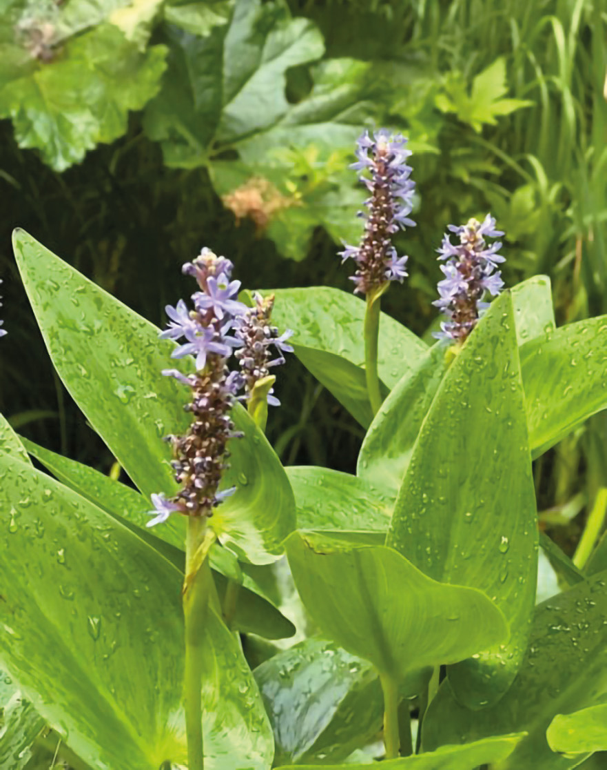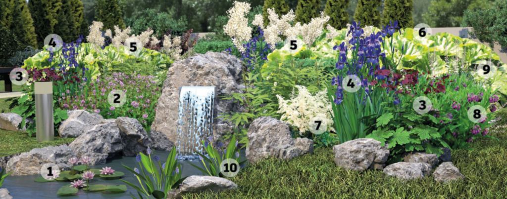 W strefie przybrzeżnej, tuż nad wodą, mięta nadwodna tworzy zwartą kępę. Ta znana wszystkim z zapachu roślina jest niezwykle elastyczna w tego typu nasadzeniach. Za sprawą pokładających się pędów świetnie maskuje brzegi zbiornika (miejsca, gdzie kończy się folia). Jej gęsta kępa odbija się w tafli wody wraz z chmarą owadów zwabionych kwiatami w kolorze lila.