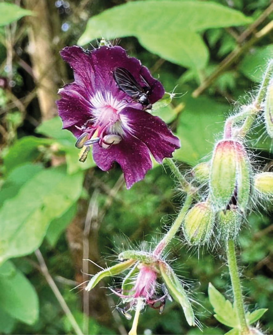 Na środku tafli również w koszyku posadzono miniaturową odmianę lilii wodnej ‘Perry's Magnificent’. Jest to nymphaea o kwiatach różowych wielkości mniej więcej 12 cm. Lilie wodne są źródłem pyłku dla owadów, a ich obecność w oczku wodnym sprzyja zapylaczom w jeszcze inny sposób.