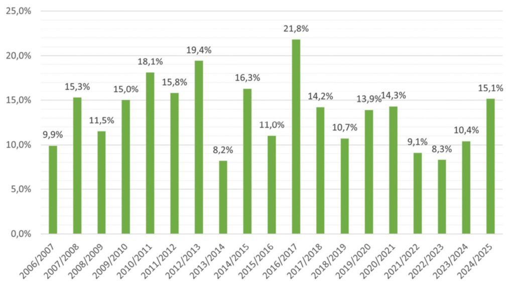 Straty rodzin pszczelich po zimie 2024/2025 wyniosły 15,14%. To alarmujący wzrost w stosunku do trzech poprzednich zimowli, gdzie straty utrzymywały się na „akceptowalnym” poziomie ok. 10% (Wykres 1).